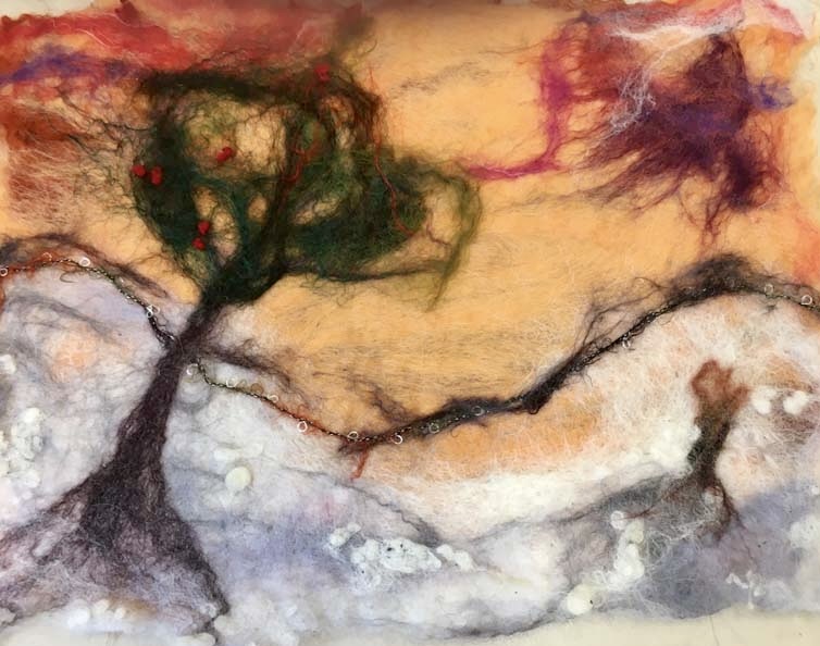 You can then choose to make a seascape, landscape, floral composition or go abstract. Select from a wide choice of gorgeous coloured wools & plant fibres. Explore blending and mixing colours and types of fibres together. Learn about their differing properties and the lovely effects that can be achieved. Try embedding plant fibres and yarns into the surface to create texture and form in your felted painting.